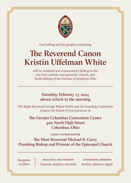 God willing and the people consenting, the Rev. Canon Kristin Uffelman White will be ordained and consecrated a bishop in the one holy, catholic, and apostolic Church and become the Tenth Bishop of the Diocese of Southern Ohio on Saturday, February 17, 2024, at 11:00 am. at the Greater Columbus Convention Center in the Short North Ballroom, located at 400 N. High Street in Columbus. The Most Rev. Michael B. Curry, Presiding Bishop and Primate of The Episcopal Church, will serve as chief consecrator.