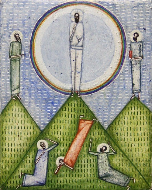 Natalya Rusetska, Transfiguration (2013, egg tempera on wood). Rusetska is an iconographer and painting from Lviv, Ukraine. Her Transfiguration icon employs the classic stylistic arrangement of Jesus, enclosed by a large aureole, or halo, standing on the peak of the mountain, flanked by Moses and Elijah, each on their own peaks slightly below Jesus. Below Jesus are the three disciples who accompanied him: Peter, James, and John. Unlike the typical icon or painted depiction which would employ gold, however, Rusetska employs vivid colors of growth and movement; the mountain grass is verdant, the sky is a clear blue, and Peter is dressed in a striking orange. The scene is alive, drawing us into that moment when Peter was awestruck, and struck down, by the radiance of Christ.