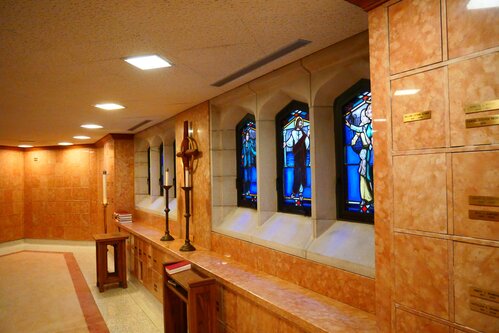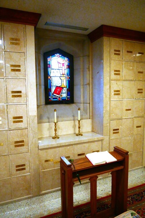 The Columbarium contains 1,154 standard niches designed to accommodate two urns, 78 large niches to hold four urns, and one family niche for 12 urns. There are a total of 1,233 niches capable of receiving 2,632 interments.