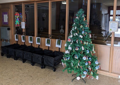 Each tag on the Angel Tree lists requested items, such as gift cards, soft bedsheets, toiletries, and activities for the whole family. Please take a tag (or several tags!), purchase the listed items, and bring those items back to church to add to our wagons. If you are unable to purchase items, but would like to help, you may provide a financial donation to purchase the necessary items. Those donations may be given to Lois in the church office. All purchased items and donations are due by Sunday, December 21st. Thank you for your generous support!